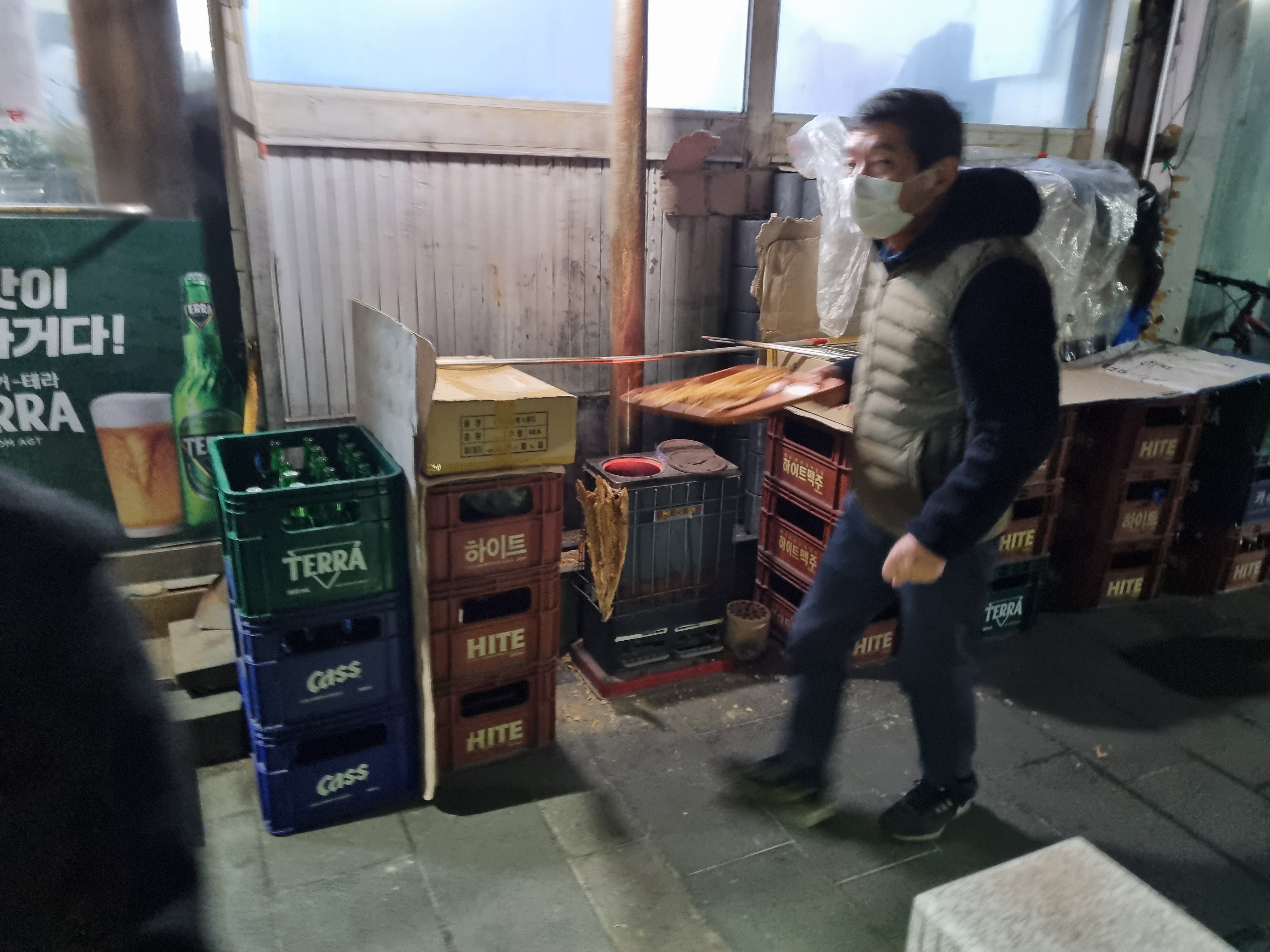 밖에 나오니 사장님이 화로에서 직접 황태를 굽고 계셨다.