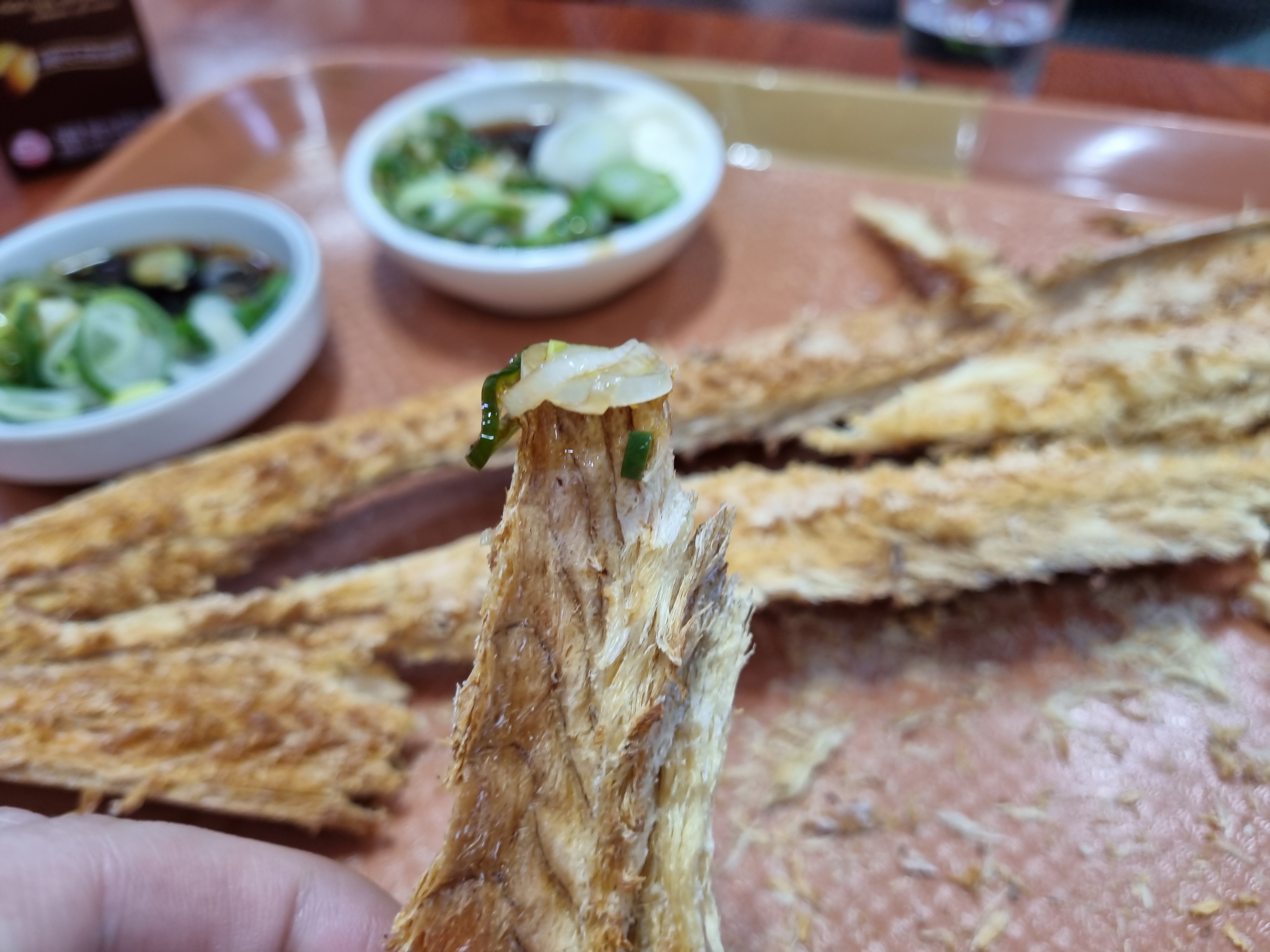 바사삭 부서지는 황태에 파와 간장을 이런식으로 찍어올려 함께 먹으면 된다.
